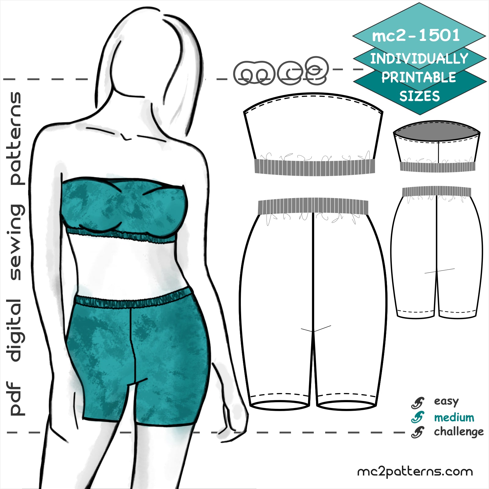 Digital PDF-pattern for sewing a 2-piece Sports-Yoga-Fitness Outfit/Swimsuit with Bandeau Top & Shorts.