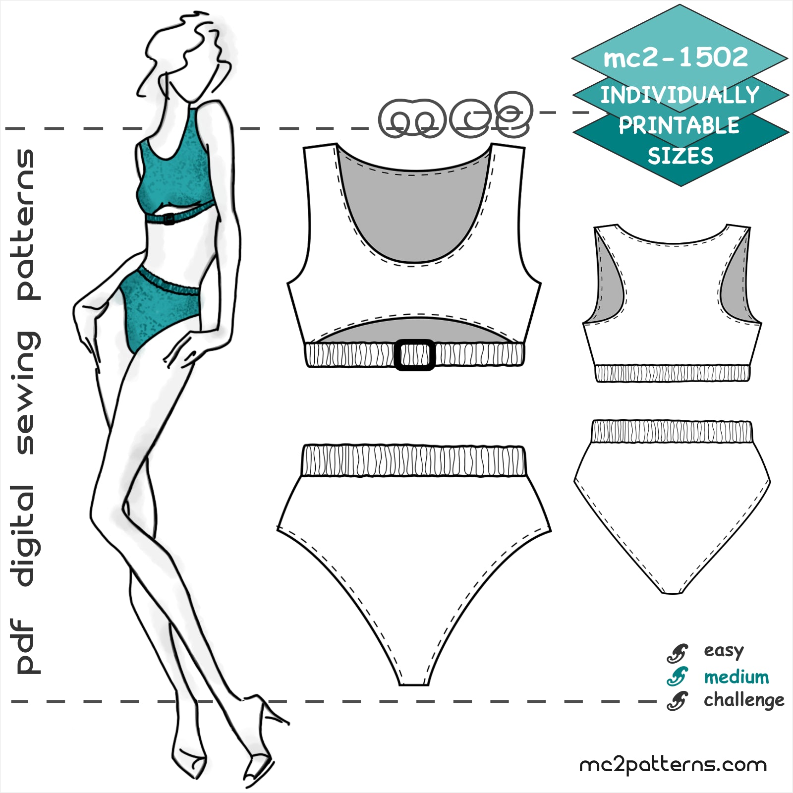 Digital PDF-pattern for sewing a 2-piece Swimsuit with Racer-back Top & High-cut Bottom.