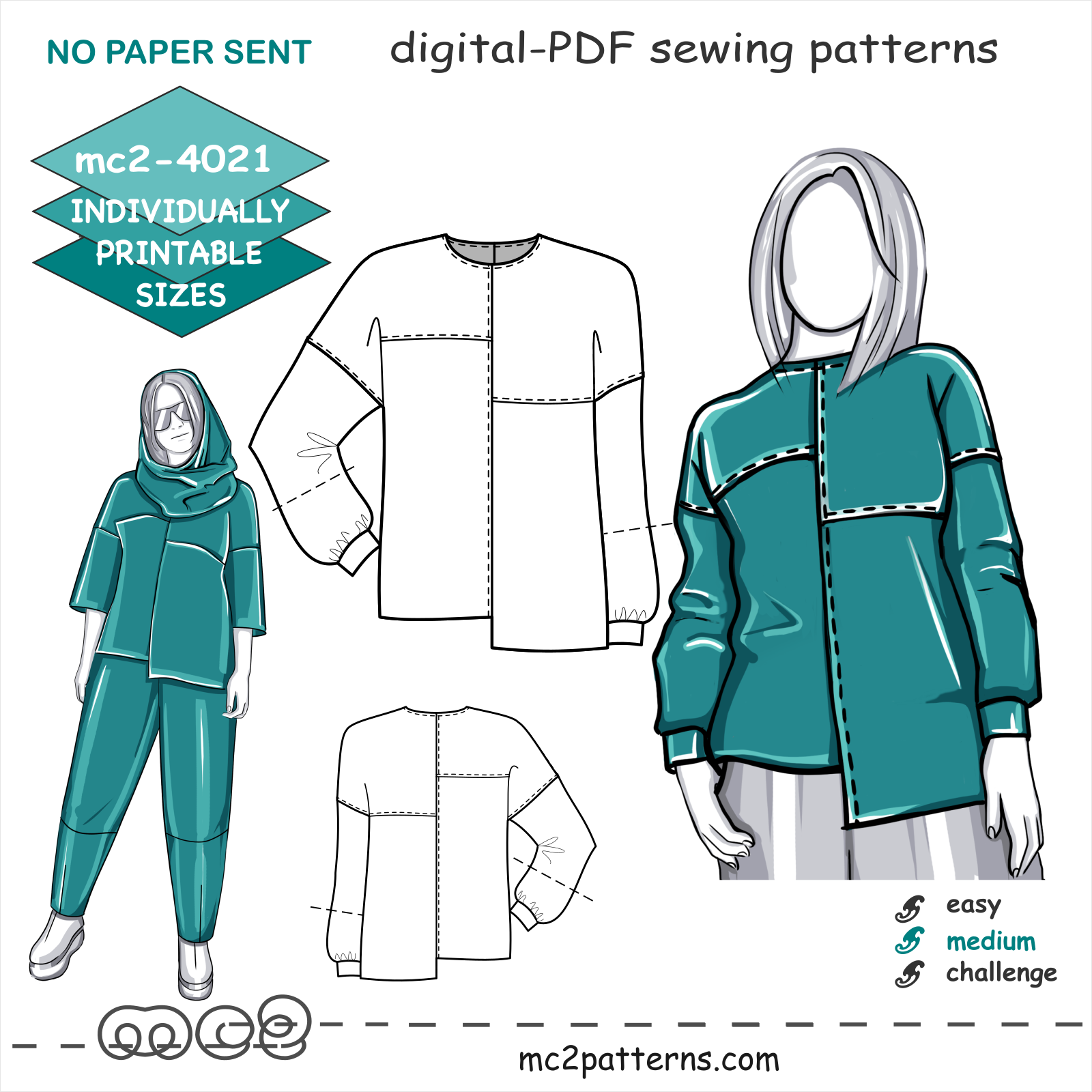 Create a stylish, modern garment with this versatile sewing pattern. The asymmetrical jersey top/sweatshirt features a relaxed, oversized silhouette and comfortable sleeves, perfect for effortless everyday wear. Distinctive visible stitching lines create a striking patchwork effect across the chest and midsection, adding a unique, contemporary flair.