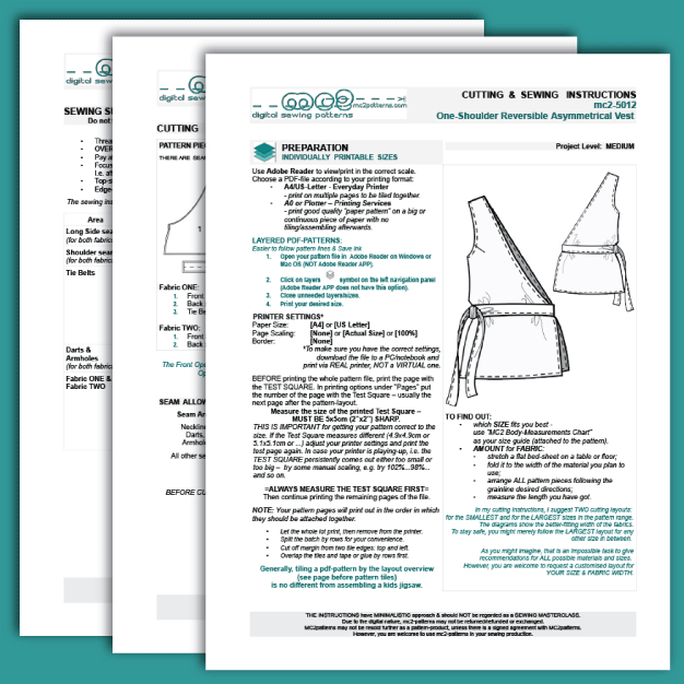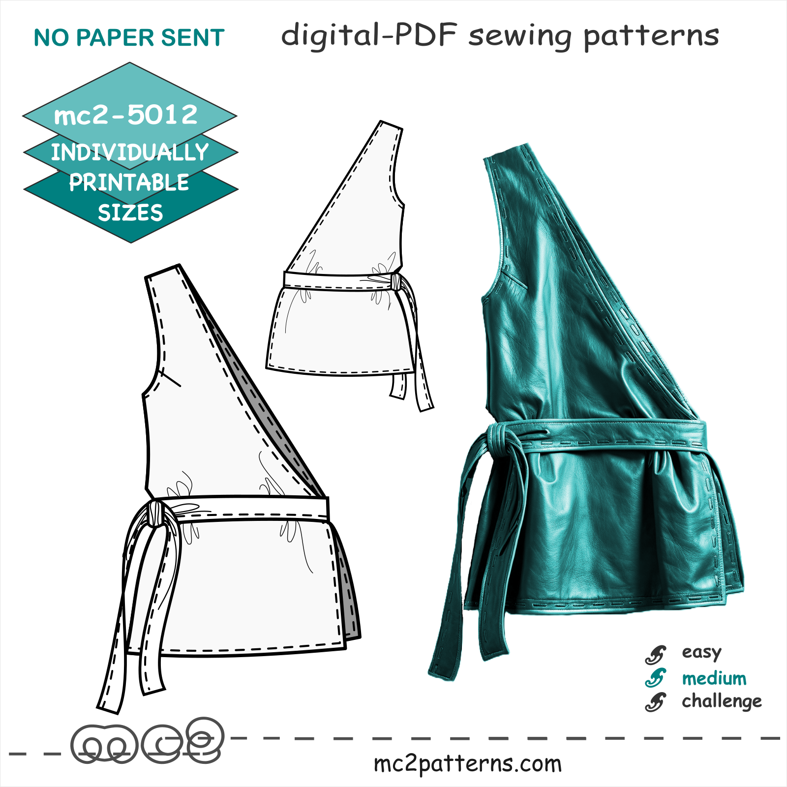 Digital-PDF pattern for sewing a Reversible Asymmetrical One-shoulder Vest.
