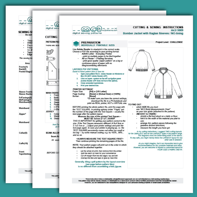 Digital PDF Sewing Pattern – Raglan Bomber Jacket with In-Seam Pockets / NOT LINED (pattern code: mc2-5009)