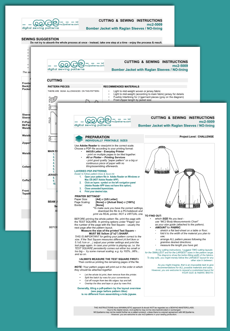 Digital-PDF pattern for sewing Raglan Bomber Jacket with Easy In-seam Pockets / NOT LINED.