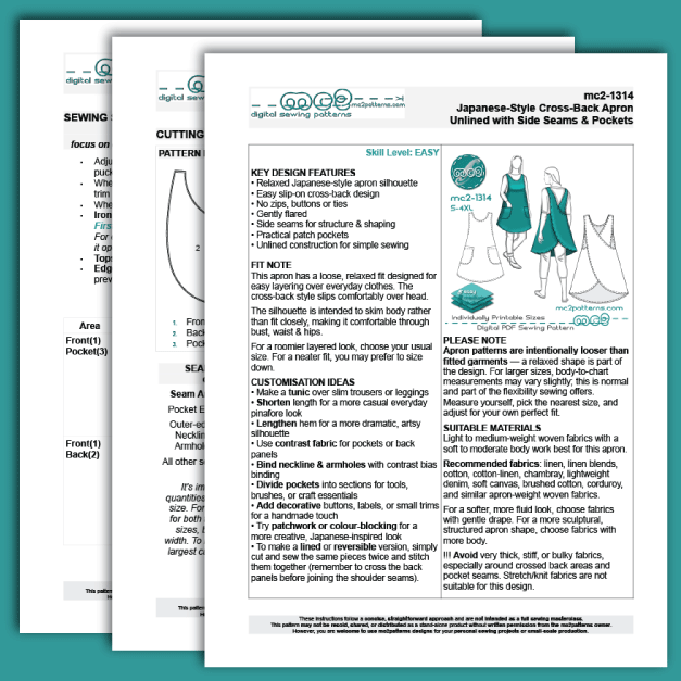 !!! Please note that apron patterns are intentionally looser than garments — a relaxed fit is part of the design. For larger sizes, body-to-chart measurements may vary slightly; this is normal and part of the flexibility sewing offers. Measure yourself, pick the nearest size, and adjust for your own perfect fit.