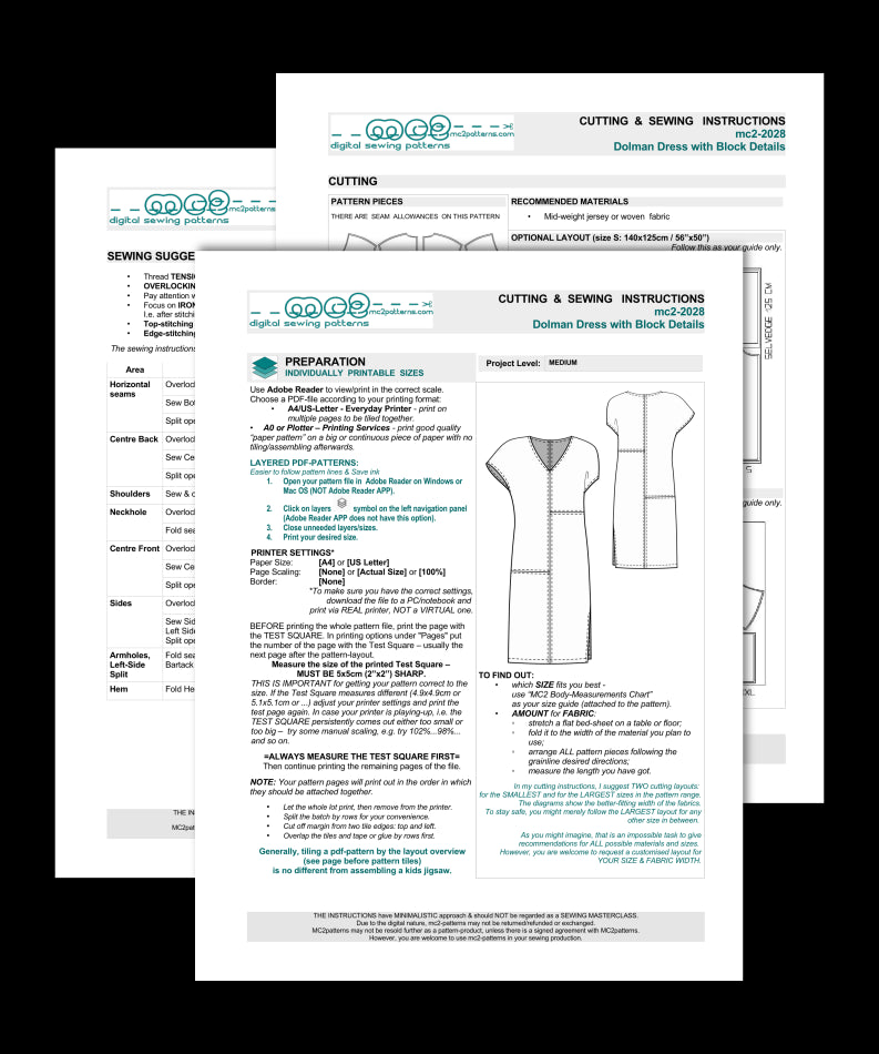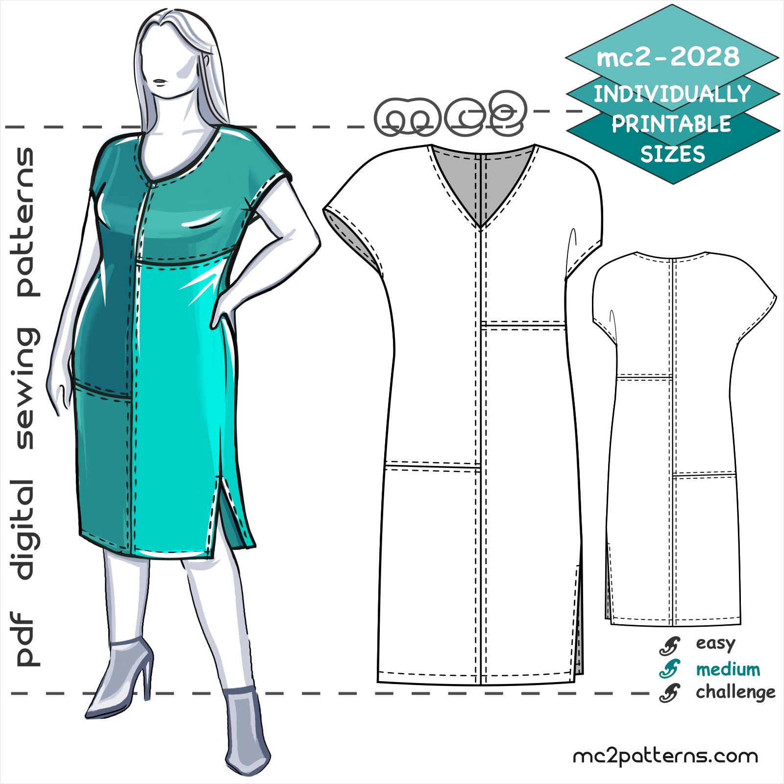 Digital PDF pattern for sewing a Drop-shoulder Dress with Flattering Slimming-Effect Block Details.