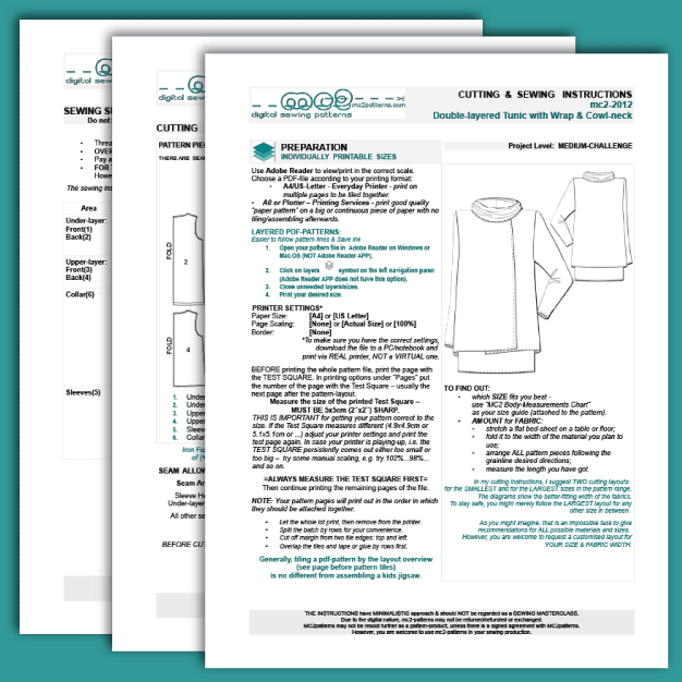 Digital-PDF pattern for sewing a Double-layer Faux-Wrap Tunic with a Cowl-neck.