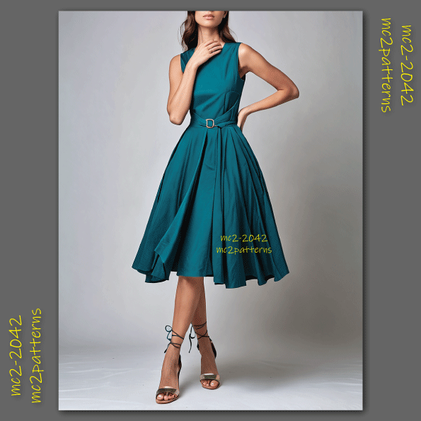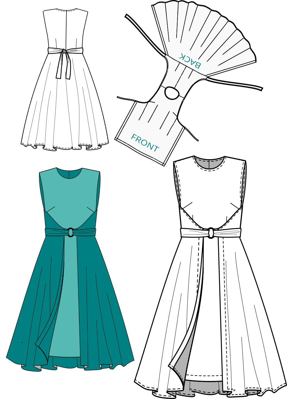 This sleeveless dress features a sleek, elegant neckline and artfully blends two distinct styles: a fitted sheath under-layer at the front and a flowing circle-skirt upper-layer at the back. Both layers are cinched with wrap-around ties at the waist for a tailored silhouette. The upper layer’s flared skirt creates a captivating whirl effect, adding dynamic movement to the design.