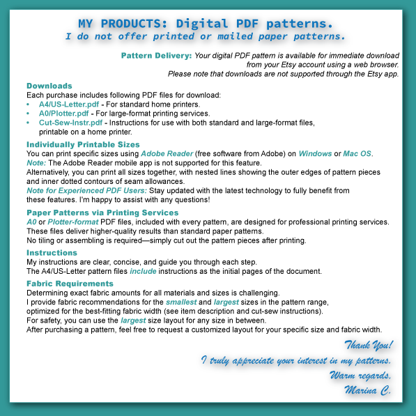 📥 WHAT YOU RECEIVE - digital PDF sewing pattern (NO paper pattern is posted):
