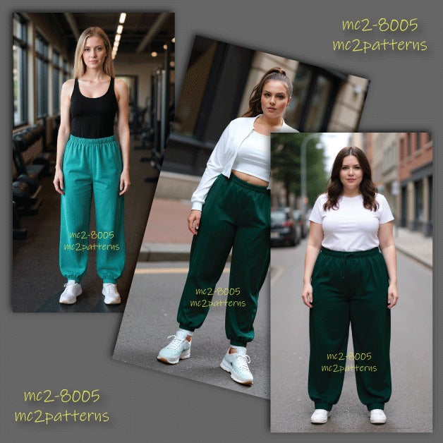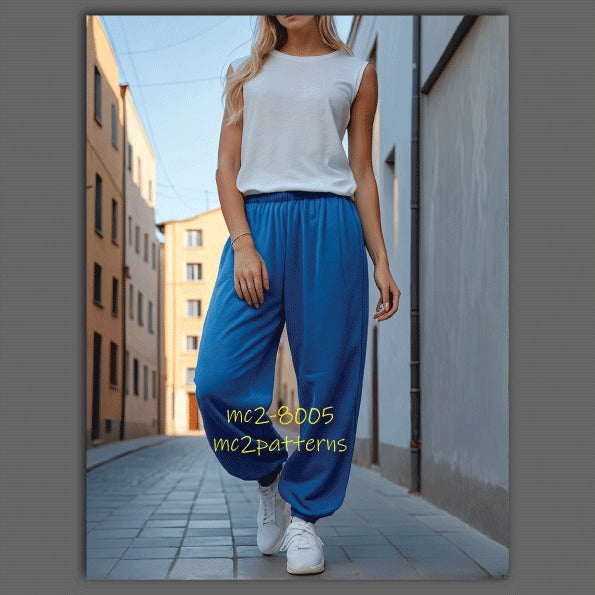 Create effortlessly stylish pocketless sweatpants with this beginner-friendly digital PDF pattern. Featuring a relaxed, comfortable fit, these pants boast a modern, balloon-like silhouette. The high, elasticated waistband ensures a secure, flattering fit with subtle gathering for a chic touch. Wide legs taper into cuffed ankles, adding a casual yet cohesive touch to the design. Crafted from soft, comfortable jersey fabric, these pants prioritise simplicity and ease of wear with a pocket-free aesthetic.