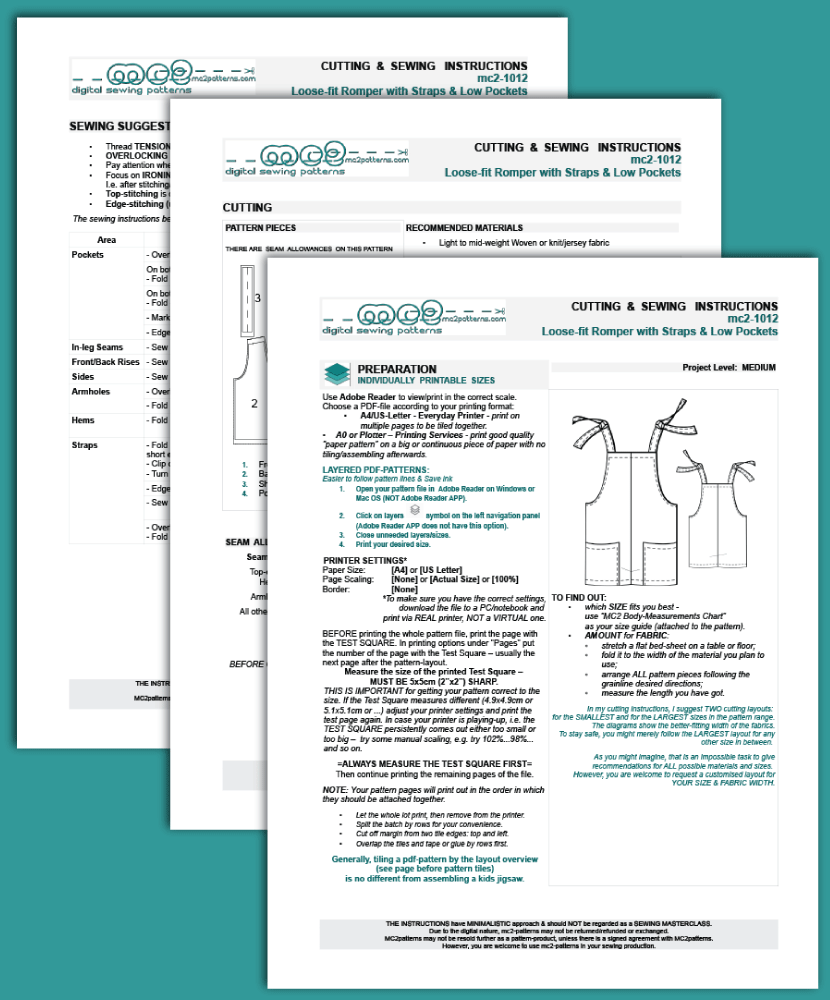 Digital PDF-pattern for sewing a Loose-fit Overall Romper with Straps & Low Pockets.