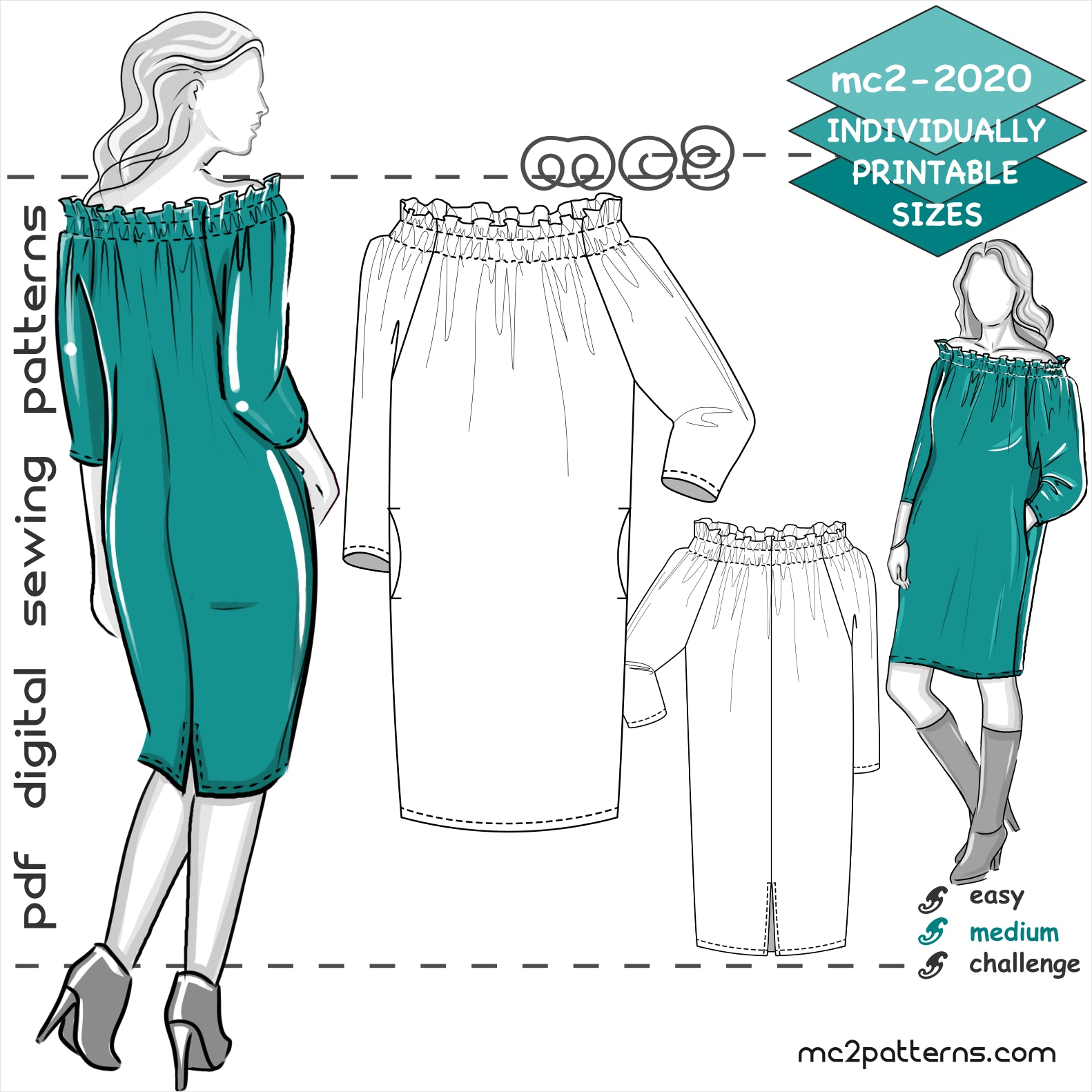Digital PDF-pattern for sewing a Loose Bardot Off-Shoulder Paper-bag Raglan Dress with In-seam Pockets.