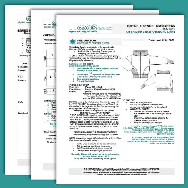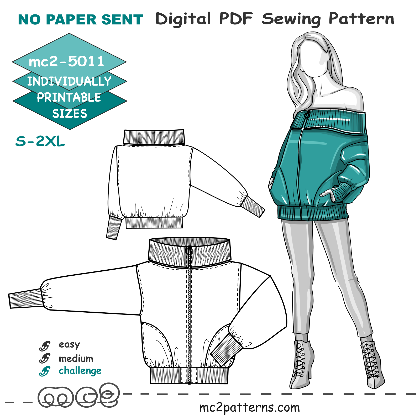 Digital-PDF pattern for sewing an Off-Shoulder Bomber Jacket with Patch Pockets / NO Lining.