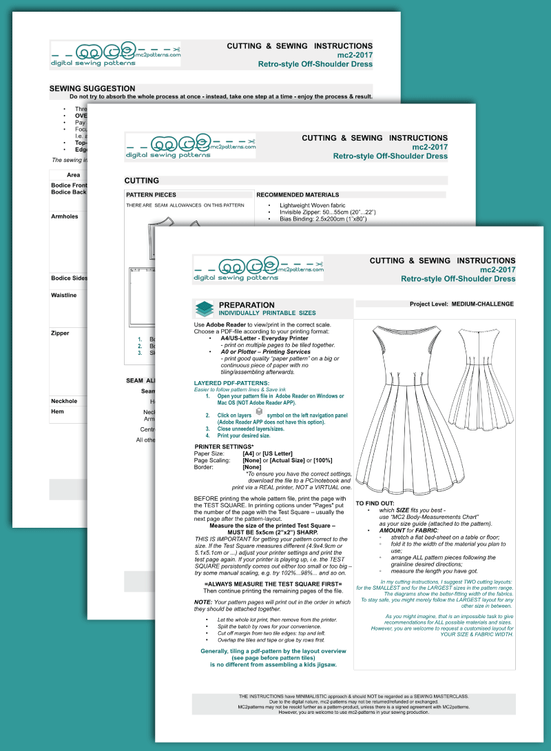 Digital-PDF pattern for sewing an Off-Shoulder Retro-style Dress with a Pleated Skirt and Back Zipper.
