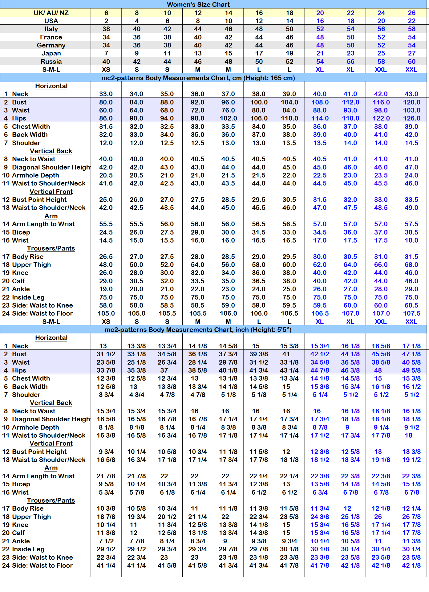 To find out which size of mc2pattern to choose – use MC2 Body Measurements Chart as your Size Guide.