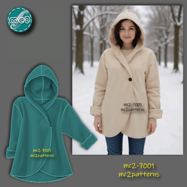 Pattern code: mc2-7001Create a chic, unlined wrap coat with a modern, relaxed silhouette. This design features a soft, draped front that wraps effortlessly across the body, secured with a single button for an adjustable, comfortable fit. The oversized hood adds warmth and a sophisticated frame around the face, while the dropped, longer back hem shapes a striking high-low profile. Long sleeves with optional turn-up cuffs bring casual charm and styling flexibility.