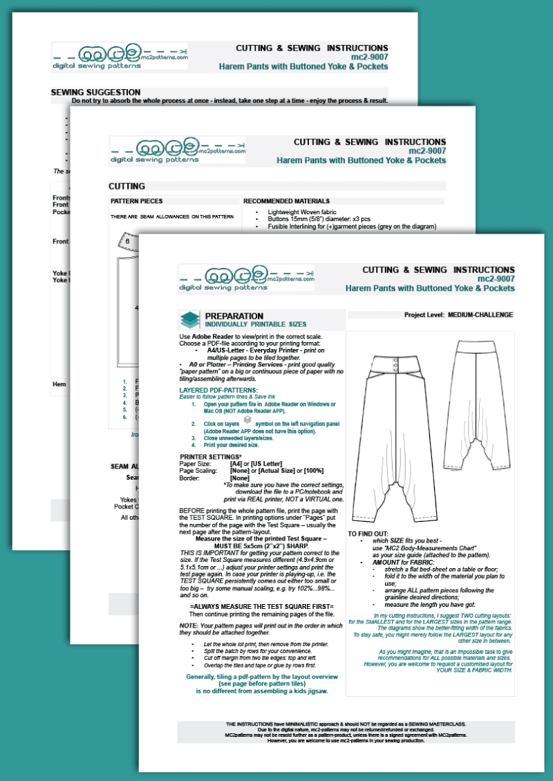 Digital PDF-pattern for sewing Smart Harem-style Pants with Buttoned Yoke & Pockets.