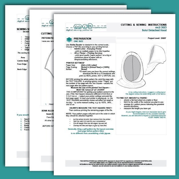 Digital PDF sewing pattern for a Solo/Detached Hood.