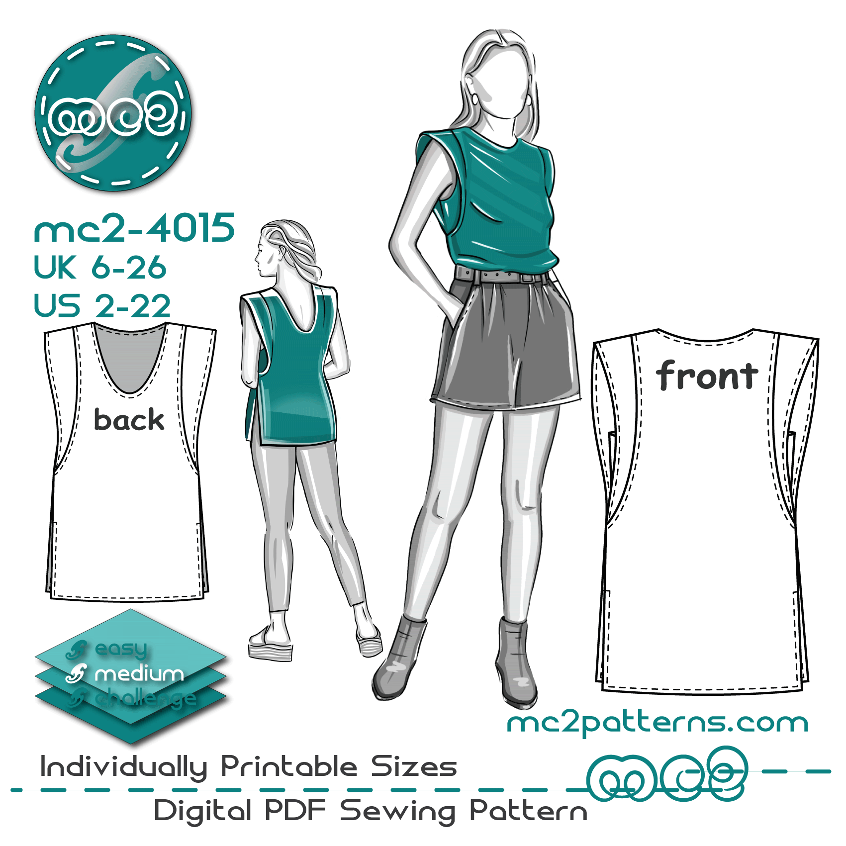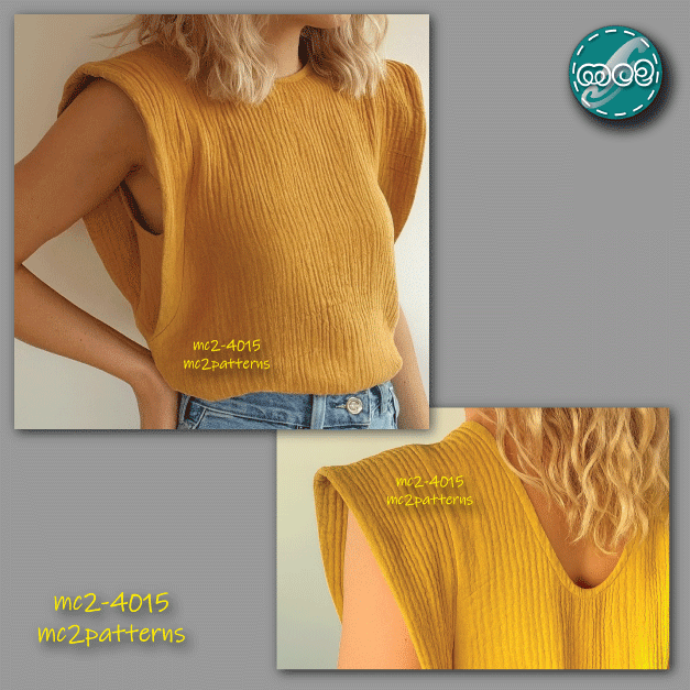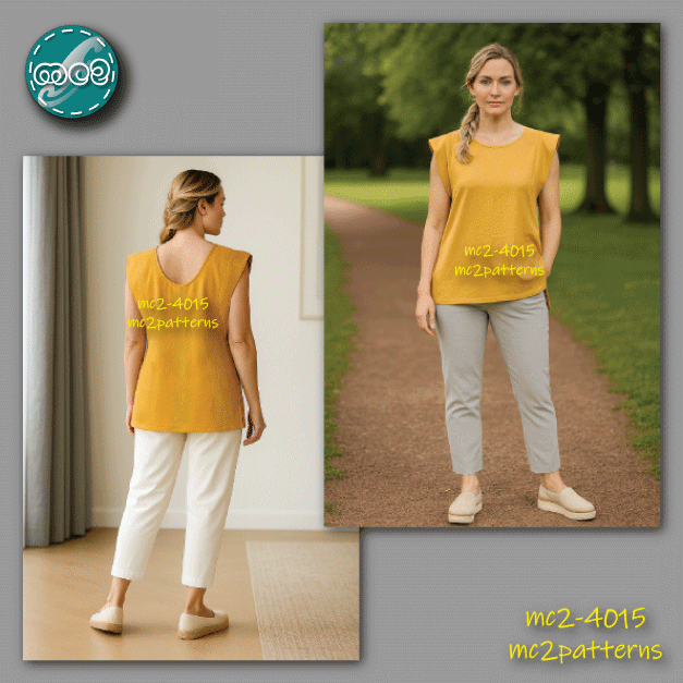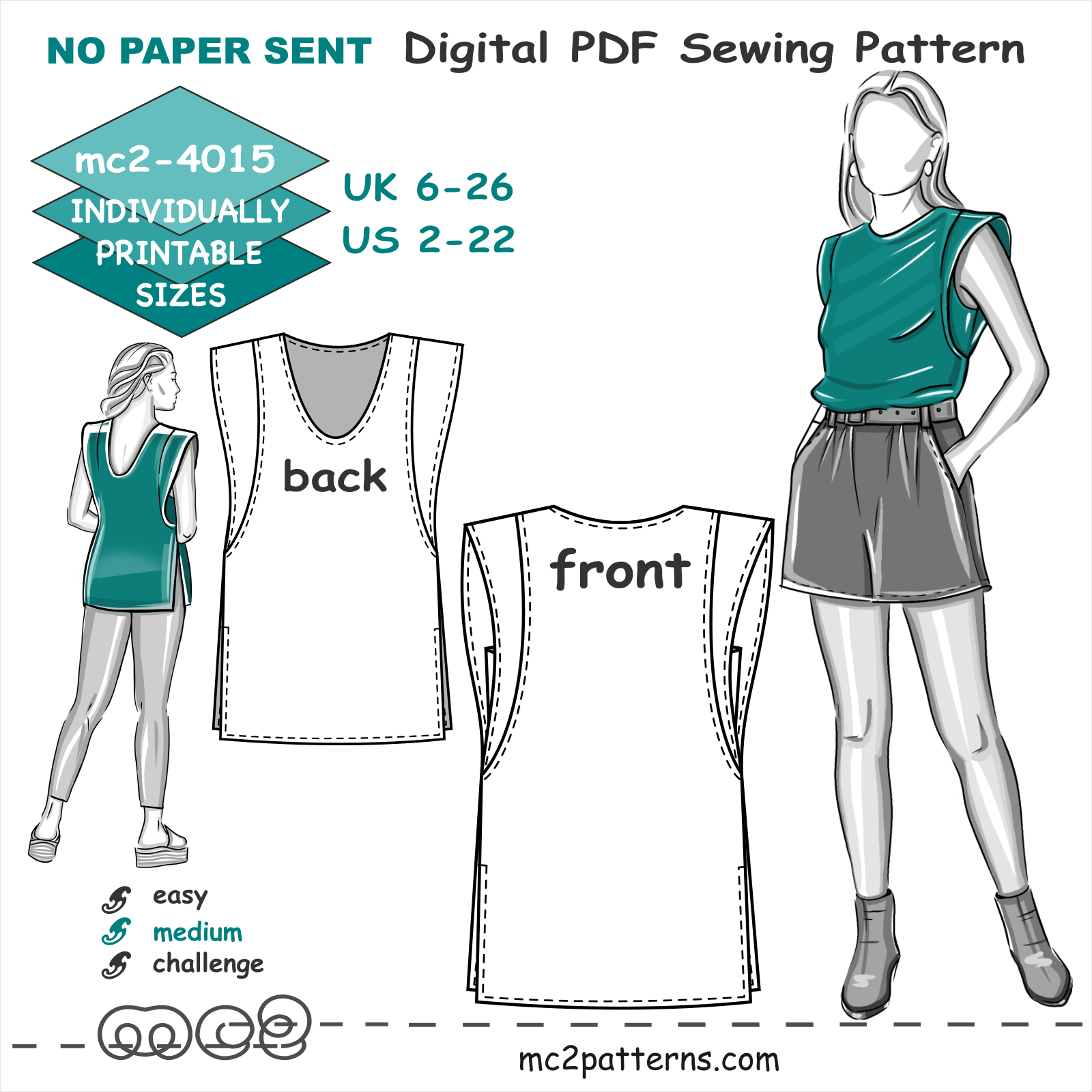 Sew your own comfy and elegant sleeveless top featuring extended “wing” shoulders and neat side vents. Perfect for both casual and smart looks — style it over shorts, trousers, or skirts.